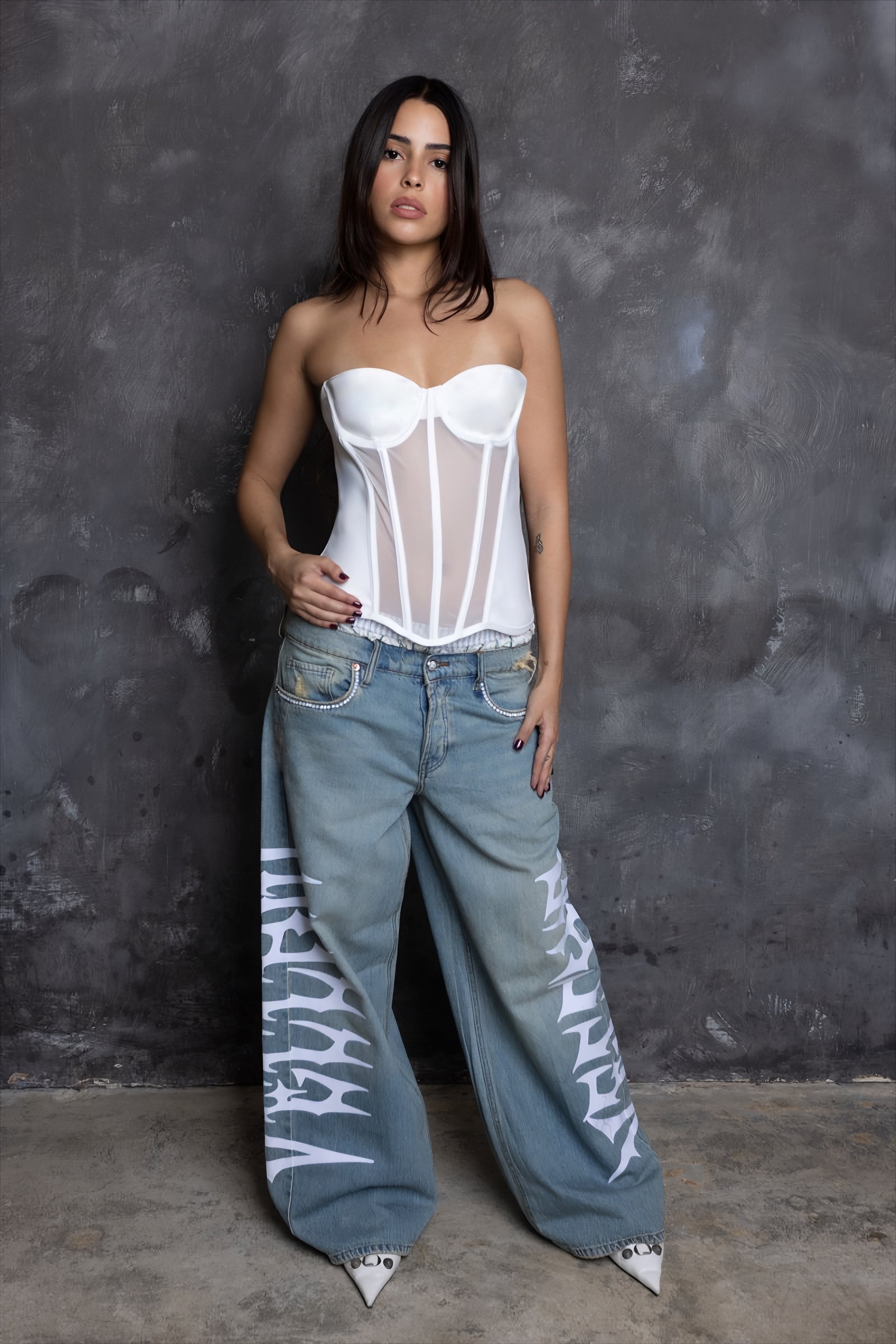 Diseño de Jeans con diseños laterales , detalles en cristales de swarovski en bolsillos y botones un estilo oversize con un corte baggy y una doble pretina .